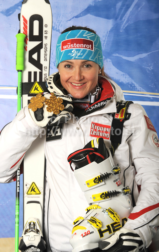 : Winner Elisabeth Goergl of Austria celebrates her medal won in women downhill race of FIS alpine skiing World Championships in Garmisch-Partenkirchen, Germany. Women downhill race of FIS alpine skiing World Championships, was held on Sunday, 13th of February 2011, in Garmisch-Partenkirchen, Germany.