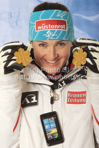 : Winner Elisabeth Goergl of Austria celebrates her medal won in women downhill race of FIS alpine skiing World Championships in Garmisch-Partenkirchen, Germany. Women downhill race of FIS alpine skiing World Championships, was held on Sunday, 13th of February 2011, in Garmisch-Partenkirchen, Germany.