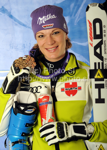 Garmisch-Partenkirchen ,Germany - 13.02.2011 : Third placed Maria Riesch of Germany celebrates her medal won in women downhill race of FIS alpine skiing World Championships in Garmisch-Partenkirchen, Germany. Women downhill race of FIS alpine skiing World Championships, was held on Sunday, 13th of February 2011, in Garmisch-Partenkirchen, Germany. Photo by: Pool/PhotoSI
