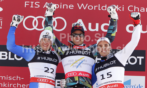 : Winner Aksel Lund Svindal of Norway (M), second placed Christof Innerhofer of Italy (L) and third placed Peter Fill of Italy (R) celebrate their medals won in men super combined race of FIS alpine skiing World Championships in Garmisch-Partenkirchen, Germany. Men super combined race of FIS alpine skiing World Championships, was held on Monday, 14th of February 2011, in Garmisch-Partenkirchen, Germany.