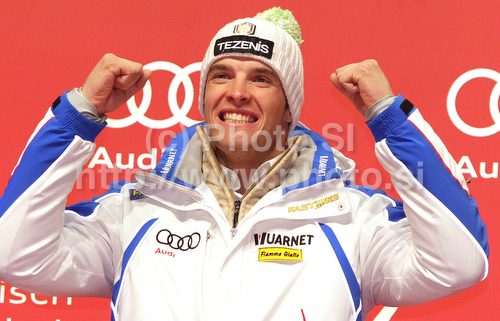 : Second placed Christof Innerhofer of Italy celebrates his medal won in men super combined race of FIS alpine skiing World Championships in Garmisch-Partenkirchen, Germany. Men super combined race of FIS alpine skiing World Championships, was held on Monday, 14th of February 2011, in Garmisch-Partenkirchen, Germany.