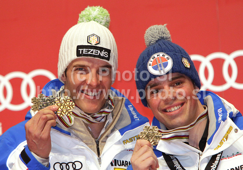 : Second placed Christof Innerhofer of Italy (L) and third placed Peter Fill of Italy (R) celebrate their medals won in men super combined race of FIS alpine skiing World Championships in Garmisch-Partenkirchen, Germany. Men super combined race of FIS alpine skiing World Championships, was held on Monday, 14th of February 2011, in Garmisch-Partenkirchen, Germany.