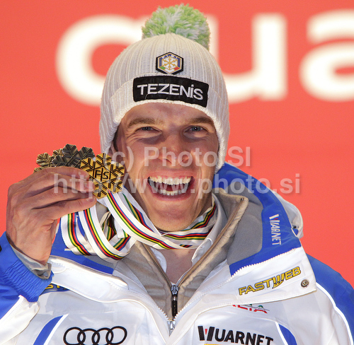 Garmisch-Partenkirchen ,Germany - 14.02.2011 : Second placed Christof Innerhofer of Italy celebrates his medal won in men super combined race of FIS alpine skiing World Championships in Garmisch-Partenkirchen, Germany. Men super combined race of FIS alpine skiing World Championships, was held on Monday, 14th of February 2011, in Garmisch-Partenkirchen, Germany. Photo by: Mitja Smid Bricelj
