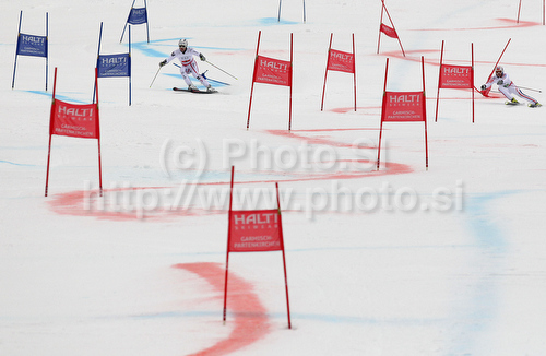 : Cyprien Richard of France and Romed Baumann of Austria skiing in team race of FIS alpine skiing World Championships in Garmisch-Partenkirchen, Germany. Team race of FIS alpine skiing World Championships, was held on Wednesday, 16th of February 2011, in Garmisch-Partenkirchen, Germany.