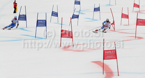: Matts Olsson of Sweden and Marc Berthod of Switzerland skiing in team race of FIS alpine skiing World Championships in Garmisch-Partenkirchen, Germany. Team race of FIS alpine skiing World Championships, was held on Wednesday, 16th of February 2011, in Garmisch-Partenkirchen, Germany.