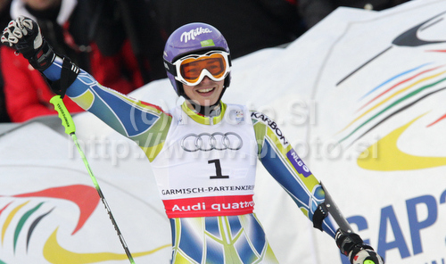 : Winner Tina Maze of Slovenia reacts in finish of second run of Women giant slalom race of FIS alpine skiing World Championships in Garmisch-Partenkirchen, Germany. Women giant slalom race of FIS alpine skiing World Championships, was held on Thursday, 17th of February 2011, in Garmisch-Partenkirchen, Germany.