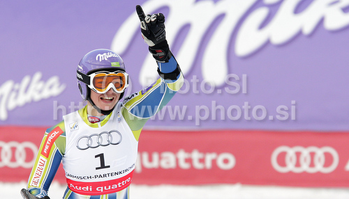 : Winner Tina Maze of Slovenia reacts in finish of second run of Women giant slalom race of FIS alpine skiing World Championships in Garmisch-Partenkirchen, Germany. Women giant slalom race of FIS alpine skiing World Championships, was held on Thursday, 17th of February 2011, in Garmisch-Partenkirchen, Germany.