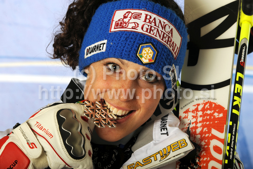 Garmisch-Partenkirchen ,Germany - 17.02.2011 : Second placed Federica Brignone of Italy celebrates her medal won in Women giant slalom race of FIS alpine skiing World Championships in Garmisch-Partenkirchen, Germany. Women giant slalom race of FIS alpine skiing World Championships, was held on Thursday, 17th of February 2011, in Garmisch-Partenkirchen, Germany. Photo by: Pool/PhotoSI