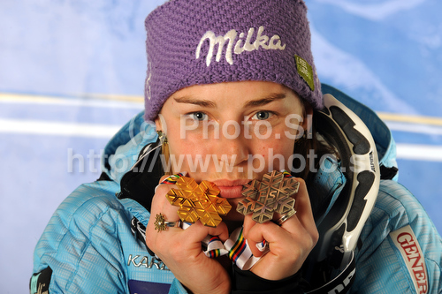 : Winner Tina Maze of Slovenia celebrates her medal won in Women giant slalom race of FIS alpine skiing World Championships in Garmisch-Partenkirchen, Germany. Women giant slalom race of FIS alpine skiing World Championships, was held on Thursday, 17th of February 2011, in Garmisch-Partenkirchen, Germany.