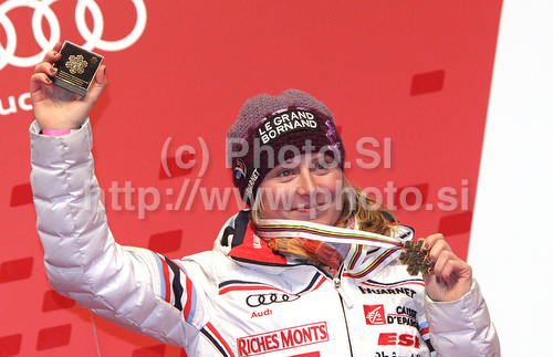 : Third placed Tessa Worley of France celebrates her medal won in Women giant slalom race of FIS alpine skiing World Championships in Garmisch-Partenkirchen, Germany. Women giant slalom race of FIS alpine skiing World Championships, was held on Thursday, 17th of February 2011, in Garmisch-Partenkirchen, Germany.