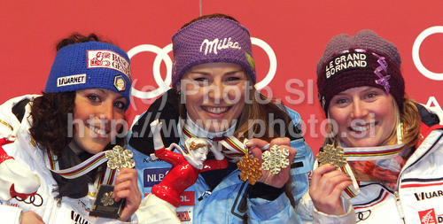 : Winner Tina Maze of Slovenia (M), second placed Federica Brignone of Italy (L) and third placed Tessa Worley of France (R) celebrate their medals won in Women giant slalom race of FIS alpine skiing World Championships in Garmisch-Partenkirchen, Germany. Women giant slalom race of FIS alpine skiing World Championships, was held on Thursday, 17th of February 2011, in Garmisch-Partenkirchen, Germany.