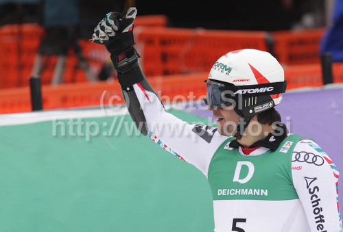 : Third placed Philipp Schoerghofer of Austria reacts in finish of second run of Men giant slalom race of FIS alpine skiing World Championships in Garmisch-Partenkirchen, Germany. Men giant slalom race of FIS alpine skiing World Championships, was held on Friday, 18th of February 2011, in Garmisch-Partenkirchen, Germany.