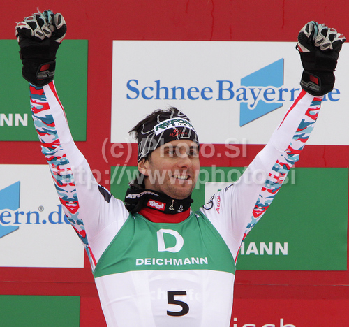 : Third placed Philipp Schoerghofer of Austria celebrates his medal won in Men giant slalom race of FIS alpine skiing World Championships in Garmisch-Partenkirchen, Germany. Men giant slalom race of FIS alpine skiing World Championships, was held on Friday, 18th of February 2011, in Garmisch-Partenkirchen, Germany.