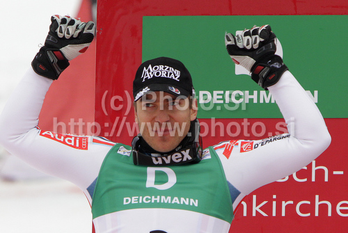 : Second placed Cyprien Richard of France celebrates his medal won in Men giant slalom race of FIS alpine skiing World Championships in Garmisch-Partenkirchen, Germany. Men giant slalom race of FIS alpine skiing World Championships, was held on Friday, 18th of February 2011, in Garmisch-Partenkirchen, Germany.