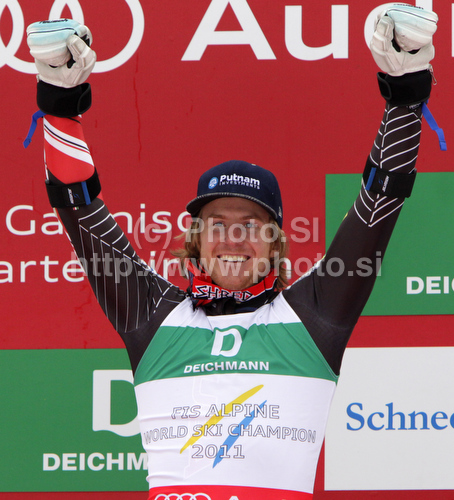 Garmisch-Partenkirchen ,Germany - 18.02.2011 : Winner Ted Ligety of USA celebrates his medal won in Men giant slalom race of FIS alpine skiing World Championships in Garmisch-Partenkirchen, Germany. Men giant slalom race of FIS alpine skiing World Championships, was held on Friday, 18th of February 2011, in Garmisch-Partenkirchen, Germany. Photo by: Mitja Smid Bricelj