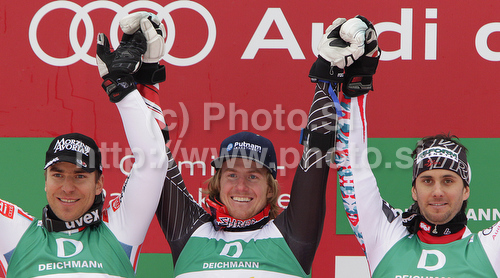 : Winner Ted Ligety of USA (M), second placed Cyprien Richard of France (L) and third placed Philipp Schoerghofer of Austria celebrate their medals won in Men giant slalom race of FIS alpine skiing World Championships in Garmisch-Partenkirchen, Germany. Men giant slalom race of FIS alpine skiing World Championships, was held on Friday, 18th of February 2011, in Garmisch-Partenkirchen, Germany.