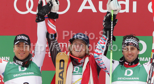 : Winner Ted Ligety of USA (M), second placed Cyprien Richard of France (L) and third placed Philipp Schoerghofer of Austria celebrate their medals won in Men giant slalom race of FIS alpine skiing World Championships in Garmisch-Partenkirchen, Germany. Men giant slalom race of FIS alpine skiing World Championships, was held on Friday, 18th of February 2011, in Garmisch-Partenkirchen, Germany.