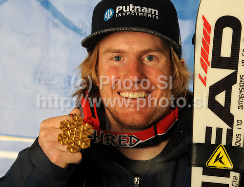 : Winner Ted Ligety of USA celebrates his medal won in Men giant slalom race of FIS alpine skiing World Championships in Garmisch-Partenkirchen, Germany. Men giant slalom race of FIS alpine skiing World Championships, was held on Friday, 18th of February 2011, in Garmisch-Partenkirchen, Germany.