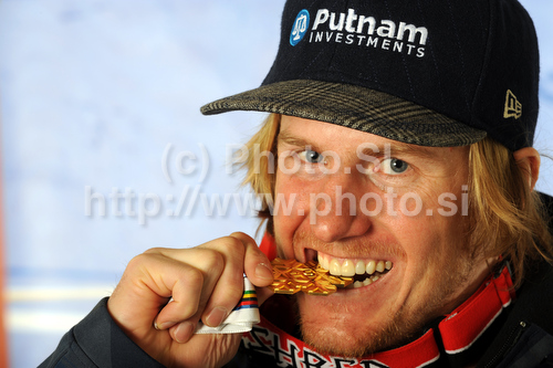 : Winner Ted Ligety of USA celebrates his medal won in Men giant slalom race of FIS alpine skiing World Championships in Garmisch-Partenkirchen, Germany. Men giant slalom race of FIS alpine skiing World Championships, was held on Friday, 18th of February 2011, in Garmisch-Partenkirchen, Germany.