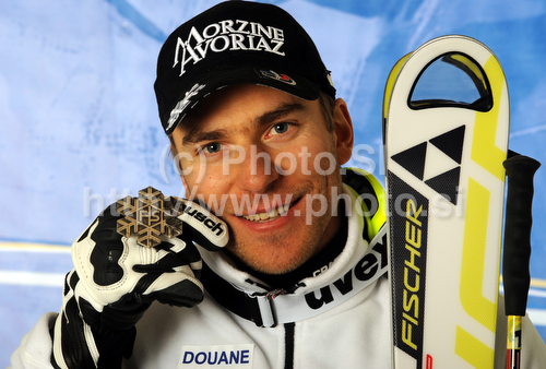 : Second placed Cyprien Richard of France celebrates his medal won in Men giant slalom race of FIS alpine skiing World Championships in Garmisch-Partenkirchen, Germany. Men giant slalom race of FIS alpine skiing World Championships, was held on Friday, 18th of February 2011, in Garmisch-Partenkirchen, Germany.