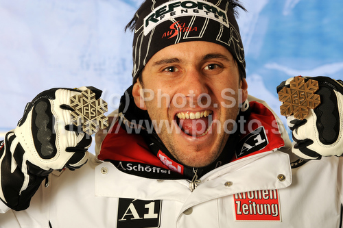 : Third placed Philipp Schoerghofer of Austria celebrates his medal won in Men giant slalom race of FIS alpine skiing World Championships in Garmisch-Partenkirchen, Germany. Men giant slalom race of FIS alpine skiing World Championships, was held on Friday, 18th of February 2011, in Garmisch-Partenkirchen, Germany.
