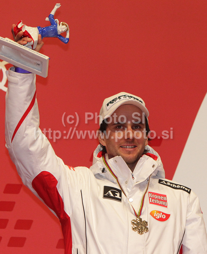 : Third placed Philipp Schoerghofer of Austria celebrates his medal won in Men giant slalom race of FIS alpine skiing World Championships in Garmisch-Partenkirchen, Germany. Men giant slalom race of FIS alpine skiing World Championships, was held on Friday, 18th of February 2011, in Garmisch-Partenkirchen, Germany.