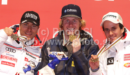 : Winner Ted Ligety of USA (M), second placed Cyprien Richard of France (L) and third placed Philipp Schoerghofer of Austria (R) celebrate their medals won in Men giant slalom race of FIS alpine skiing World Championships in Garmisch-Partenkirchen, Germany. Men giant slalom race of FIS alpine skiing World Championships, was held on Friday, 18th of February 2011, in Garmisch-Partenkirchen, Germany.