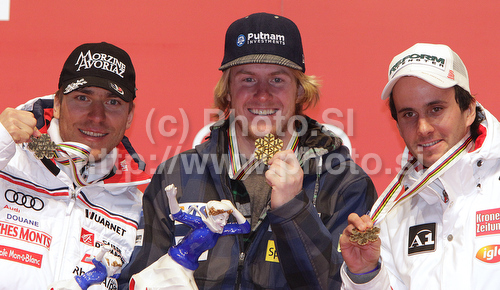 Garmisch-Partenkirchen ,Germany - 18.02.2011 : Winner Ted Ligety of USA (M), second placed Cyprien Richard of France (L) and third placed Philipp Schoerghofer of Austria (R) celebrate their medals won in Men giant slalom race of FIS alpine skiing World Championships in Garmisch-Partenkirchen, Germany. Men giant slalom race of FIS alpine skiing World Championships, was held on Friday, 18th of February 2011, in Garmisch-Partenkirchen, Germany. Photo by: Mitja Smid Bricelj