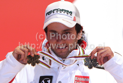: Third placed Philipp Schoerghofer of Austria celebrates his medal won in Men giant slalom race of FIS alpine skiing World Championships in Garmisch-Partenkirchen, Germany. Men giant slalom race of FIS alpine skiing World Championships, was held on Friday, 18th of February 2011, in Garmisch-Partenkirchen, Germany.