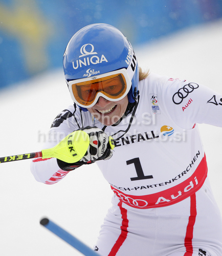 : Marlies Schild of Austria skiing in first run of Women slalom race of FIS alpine skiing World Championships in Garmisch-Partenkirchen, Germany. Women slalom race of FIS alpine skiing World Championships, was held on Saturday, 19th of February 2011, in Garmisch-Partenkirchen, Germany.