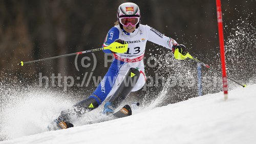 : Manuela Moelgg of Italy skiing in first run of Women slalom race of FIS alpine skiing World Championships in Garmisch-Partenkirchen, Germany. Women slalom race of FIS alpine skiing World Championships, was held on Saturday, 19th of February 2011, in Garmisch-Partenkirchen, Germany.