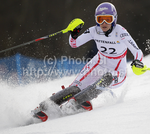 : Michaela Kirchgasser of Austria skiing in first run of Women slalom race of FIS alpine skiing World Championships in Garmisch-Partenkirchen, Germany. Women slalom race of FIS alpine skiing World Championships, was held on Saturday, 19th of February 2011, in Garmisch-Partenkirchen, Germany.