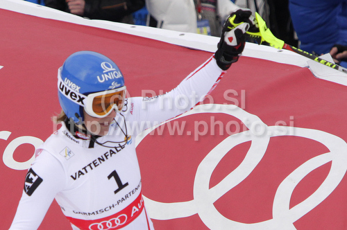: Marlies Schild of Austria reacts in finish of first run of Women slalom race of FIS alpine skiing World Championships in Garmisch-Partenkirchen, Germany. Women slalom race of FIS alpine skiing World Championships, was held on Saturday, 19th of February 2011, in Garmisch-Partenkirchen, Germany.