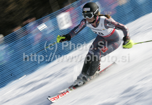 : Erin Mielzynski of Canada skiing in second run of Women slalom race of FIS alpine skiing World Championships in Garmisch-Partenkirchen, Germany. Women slalom race of FIS alpine skiing World Championships, was held on Saturday, 19th of February 2011, in Garmisch-Partenkirchen, Germany.