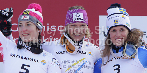: Winner Marlies Schild of Austria (M), second placed Kathrin Zettel of Austria (L) and third placed Maria Pietilae-Holmner of Sweden (R) celebrate their medals won in Women slalom race of FIS alpine skiing World Championships in Garmisch-Partenkirchen, Germany. Women slalom race of FIS alpine skiing World Championships, was held on Saturday, 19th of February 2011, in Garmisch-Partenkirchen, Germany.