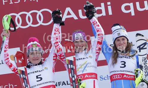 Garmisch-Partenkirchen ,Germany - 19.02.2011 : Winner Marlies Schild of Austria (M), second placed Kathrin Zettel of Austria (L) and third placed Maria Pietilae-Holmner of Sweden (R) celebrate their medals won in Women slalom race of FIS alpine skiing World Championships in Garmisch-Partenkirchen, Germany. Women slalom race of FIS alpine skiing World Championships, was held on Saturday, 19th of February 2011, in Garmisch-Partenkirchen, Germany. Photo by: Mitja Smid Bricelj