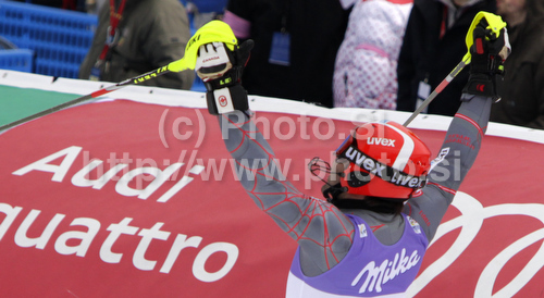 : Fifth placed Julien Cousineau of Canada reacts in finish of second run of Men slalom race of FIS alpine skiing World Championships in Garmisch-Partenkirchen, Germany. Men slalom race of FIS alpine skiing World Championships, was held on Sunday, 20th of February 2011, in Garmisch-Partenkirchen, Germany.