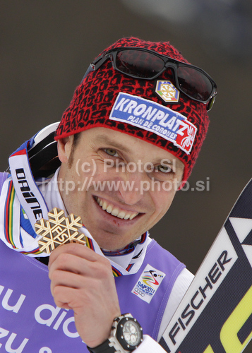 : Third placed Manfred Moelgg of Italy celebrates his medal won in Men slalom race of FIS alpine skiing World Championships in Garmisch-Partenkirchen, Germany. Men slalom race of FIS alpine skiing World Championships, was held on Sunday, 20th of February 2011, in Garmisch-Partenkirchen, Germany.