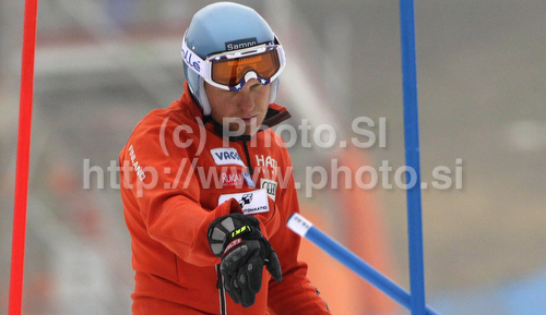 : Kalle Palander of Finland during inspection of first run of Men slalom race of FIS alpine skiing World Championships in Garmisch-Partenkirchen, Germany. Men slalom race of FIS alpine skiing World Championships, was held on Sunday, 20th of February 2011, in Garmisch-Partenkirchen, Germany.