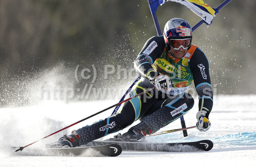: Aksel Lund Svindal of Norway skiing in first run of Men giant slalom race of Audi FIS alpine skiing World Cup 2010-2011 in Kranjska Gora, Slovenia. Men giant slalom race of FIS alpine skiing World Championships, was held on Saturday, 5th of March 2011, in Kranjska Gora, Slovenia.