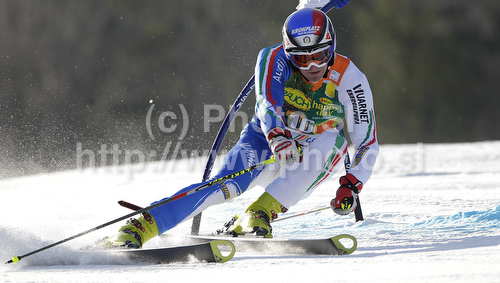: Manfred Moelgg of Italy skiing in first run of Men giant slalom race of Audi FIS alpine skiing World Cup 2010-2011 in Kranjska Gora, Slovenia. Men giant slalom race of FIS alpine skiing World Championships, was held on Saturday, 5th of March 2011, in Kranjska Gora, Slovenia.