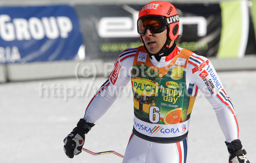 : Fourth placed Cyprien Richard of France reacts in finish of second run of Men giant slalom race of Audi FIS alpine skiing World Cup 2010-2011 in Kranjska Gora, Slovenia. Men giant slalom race of FIS alpine skiing World Championships, was held on Saturday, 5th of March 2011, in Kranjska Gora, Slovenia.