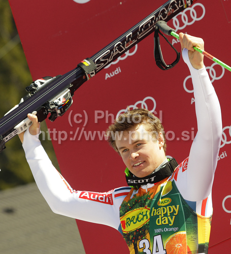 Kranjska Gora ,Slovenia - 05.03.2011 : Second placed Alexis Pinturault of France celebrates his medal won in Men giant slalom race of Audi FIS alpine skiing World Cup 2010-2011 in Kranjska Gora, Slovenia. Men giant slalom race of FIS alpine skiing World Championships, was held on Saturday, 5th of March 2011, in Kranjska Gora, Slovenia. Photo by: Primoz Jeroncic