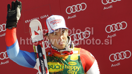 : Winner Carlo Janka of Switzerland celebrates his medal won in Men giant slalom race of Audi FIS alpine skiing World Cup 2010-2011 in Kranjska Gora, Slovenia. Men giant slalom race of FIS alpine skiing World Championships, was held on Saturday, 5th of March 2011, in Kranjska Gora, Slovenia.