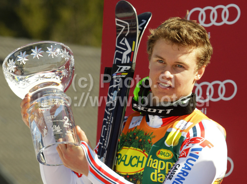 : Second placed Alexis Pinturault of France celebrates his medal won in Men giant slalom race of Audi FIS alpine skiing World Cup 2010-2011 in Kranjska Gora, Slovenia. Men giant slalom race of FIS alpine skiing World Championships, was held on Saturday, 5th of March 2011, in Kranjska Gora, Slovenia.