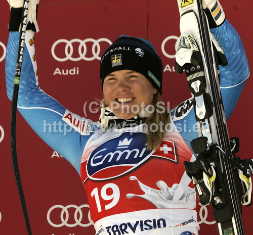 : Anja Paerson of Sweden celebrates her medal won in Women downhill race of Audi FIS alpine skiing World Cup 2010-2011 in Tarvisio, Italy. Women downhill race of Audi FIS alpine skiing World Cup 2010-2011, was held on Saturday, 5th of March 2011, in Tarvisio, Italy.