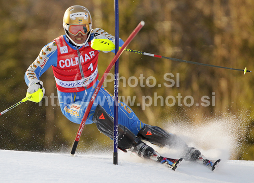 : Andre Myhrer of Sweden skiing in first run of Men slalom race of Audi FIS alpine skiing World Cup 2010-2011 in Kranjska Gora, Slovenia. Men slalom race of FIS alpine skiing World Championships, was held on Sunday, 6th of March 2011, in Kranjska Gora, Slovenia.
