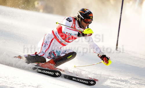 : Mario Matt of Austria skiing in first run of Men slalom race of Audi FIS alpine skiing World Cup 2010-2011 in Kranjska Gora, Slovenia. Men slalom race of FIS alpine skiing World Championships, was held on Sunday, 6th of March 2011, in Kranjska Gora, Slovenia.