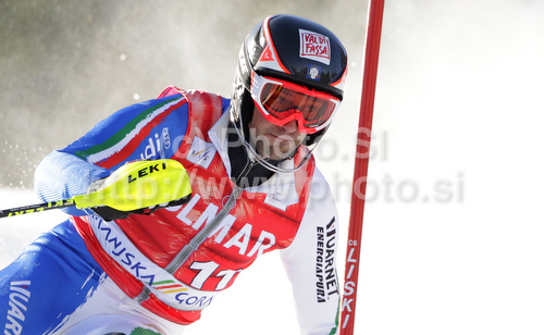: Cristian Deville of Italy skiing in first run of Men slalom race of Audi FIS alpine skiing World Cup 2010-2011 in Kranjska Gora, Slovenia. Men slalom race of FIS alpine skiing World Championships, was held on Sunday, 6th of March 2011, in Kranjska Gora, Slovenia.