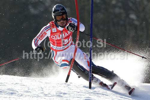 : Victor Muffat Jeandet of France skiing in first run of Men slalom race of Audi FIS alpine skiing World Cup 2010-2011 in Kranjska Gora, Slovenia. Men slalom race of FIS alpine skiing World Championships, was held on Sunday, 6th of March 2011, in Kranjska Gora, Slovenia.